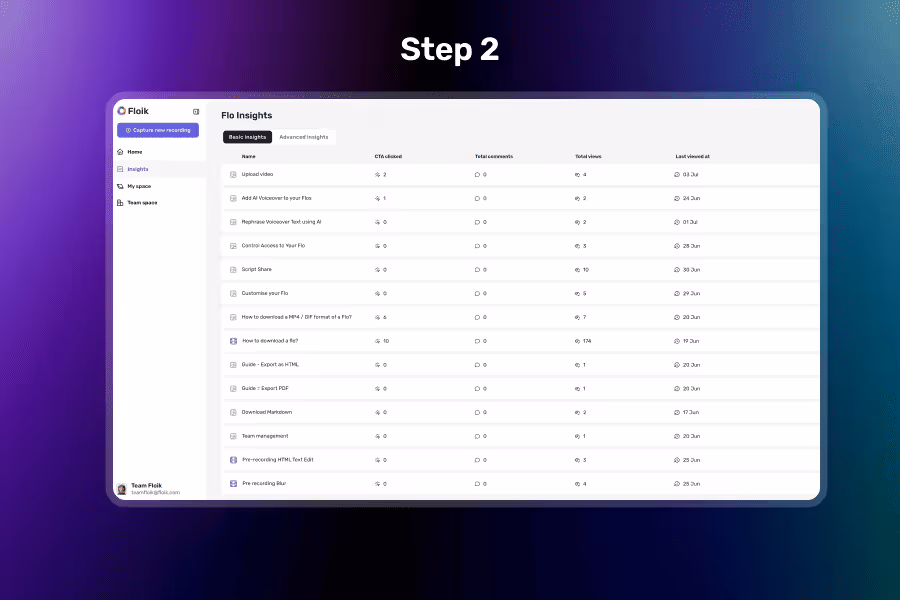 You can track total views, total clicks, and comments added across all published Flos.In Advanced Insights, you also get step-level click data — including both unique and total clicks per step.