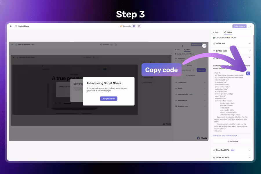 In the Share tab of your Flo, open the </> Script accordion. You’ll find a unique Flo tag there — something like: