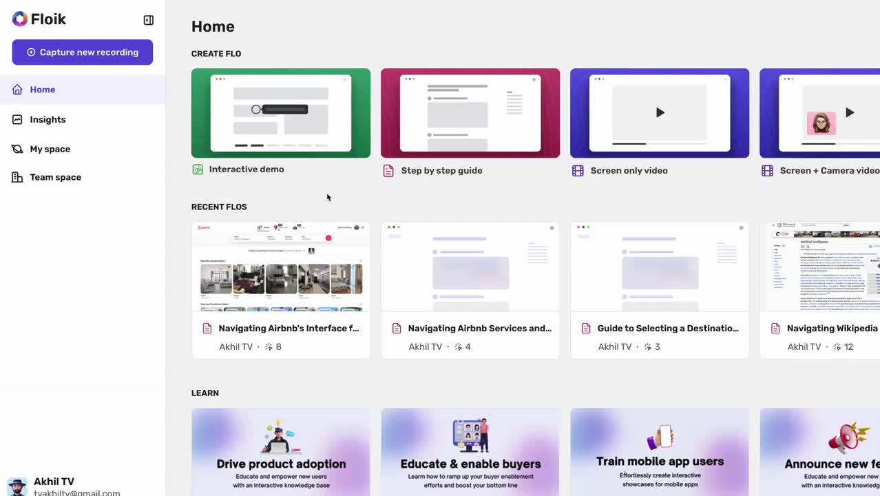Once you have installed the Chrome extension on your browser, you can sign up and hit on capture new recording. Choose the video template, click through your product and end the recoding. Now click on generate an Interactive demo on Floik.